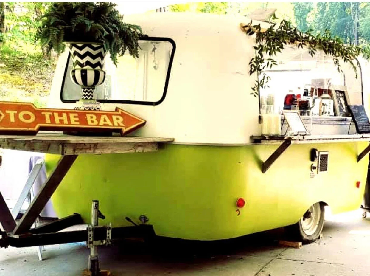 A caravan bar is a charming and quirky addition to your event. The Tipsy Goat, named for our beloved fainting goat, Sadie, is a 1974 Scamp trailer retrofitted as an event bar. It can be used inside the barn or outside on the grounds.